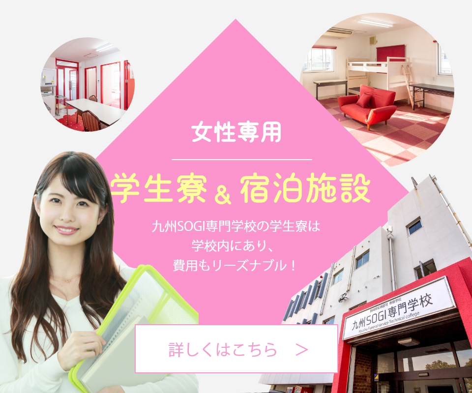 葬儀=「SOGI」、県内外からの学生募集を行うため「九州」とつけました。所在地は長崎県長崎市の光町。夜景で有名な稲佐山の登り口にある4階建ての校舎が当校です。学科名は「デュアルシステム科」、学生は1年間の集中座学講義と企業実習のデュアルシステムで実践的に学びスキルを会得。1人前の湯灌納棺師を育成するため「湯灌納棺師コース」と名付けました。