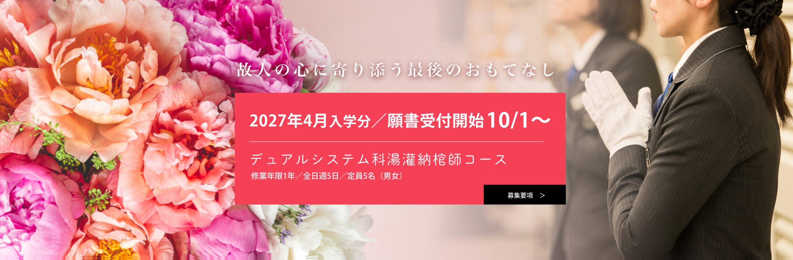 「座学」「湯灌納棺コーディネート実務」「総合企業実習」「ビジネスマナー」の4つのカリキュラムからなり、企業実習は葬祭場で執り行われるすべての儀式まで補助要員として基本から学びます。さらに実習報酬費も受取ることができるのも特徴のひとつです。